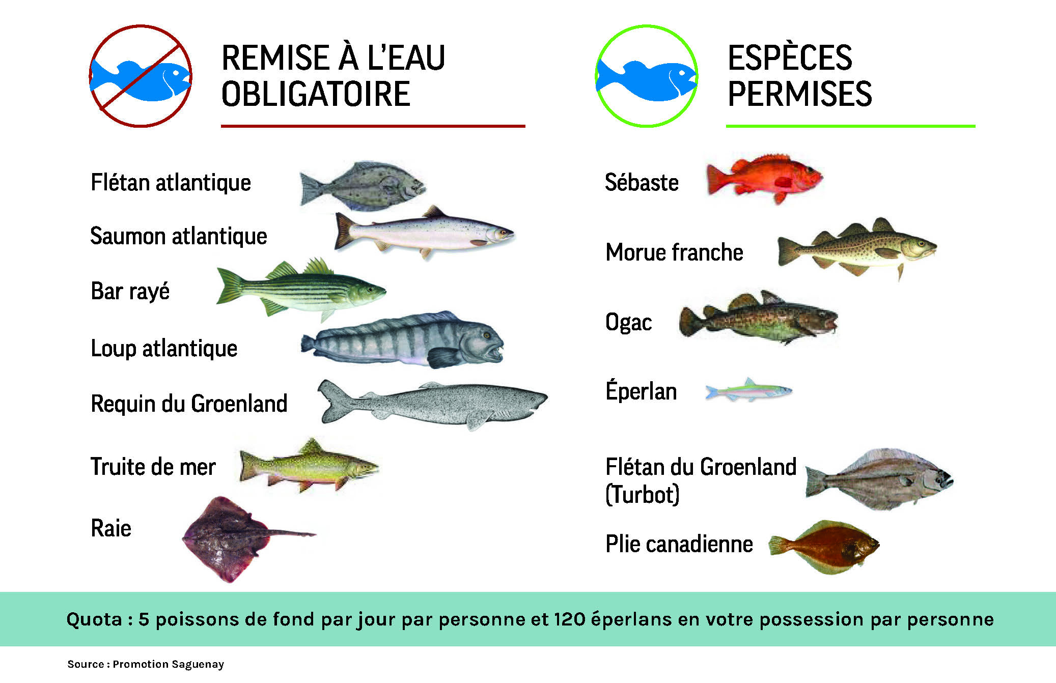 Autrement, voici un petit guide facile pour connaitre les espèces autorisées avec les quotas et celles qui doivent être remises à l’eau!